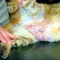 Miliaire dermatitis is een aandoening waarbij op de huid van de kat vele korstjes ontstaan.