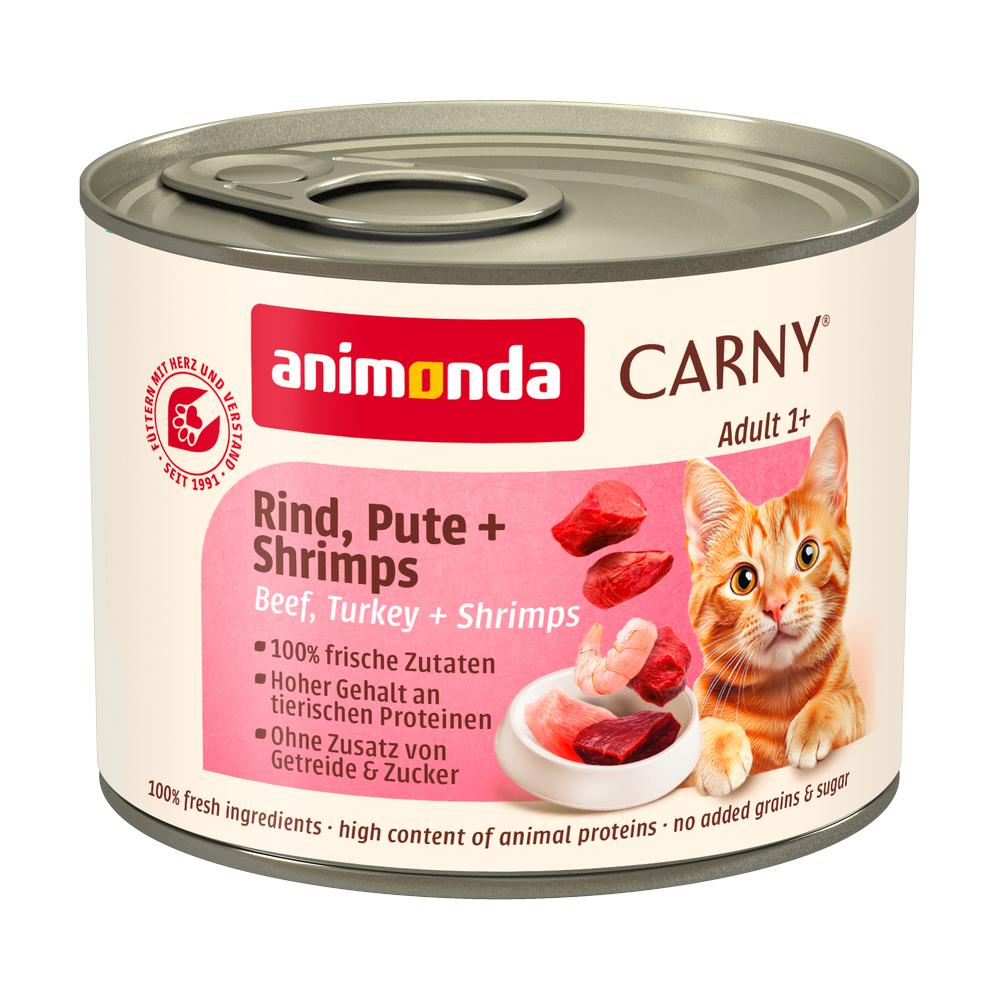 De natuurlijke voeding van katten draait geheel om vlees, plantaardige bestanddelen zijn voor een soortgerichte en natuurlijke voeding ongeschikt, omdat katten daardoor niet alle belangrijke voedingsstoffen binnen krijgen. Bovendien zijn granen een bron van voedingsonverdraagzaamheden en kunnen vaak moeilijk worden verteerd. Op basis hiervan wordt bij de receptuur van animonda Carny Adult geheel van het gebruik van granen afgezien. Ook soja, wat eveneens een hoog allergisch potentieel heeft, wordt niet gebruikt. Als belangrijke bron van proteïne zijn alleen verse ingrediënten waaronder hart, long, spiervlees en lever gebruikt. Deze hoogwaardige dierlijke eiwitbronnen leveren bovendien natuurlijke taurine, een aminozuur dat essentieel voor katten is. Dat is namelijk een aminozuur dat een kat niet zelf kan aanmaken en moet het daarom uit voeding halen. Taurine bevordert onder andere een sterk immuunsysteem, een gezond hart en het zicht. Ook een glanzende vacht en gezonde huid worden erdoor bevorderd. Van het gebruik van kunstmatige kleurstoffen of conserveringsmiddelen wordt ook compleet afgezien. Door de toevoeging van belangrijke vitaminen en mineraalstoffen bevat dit voer alle voedingsstoffen die een kat nodig heeft. animonda Carny Adult 200 g is nu verkrijgbaar in twee gemengde megapakken. Je ontvangt: Combinatie met gevogelte rund: 3 x Multivlees cocktail 3 x Rund, Kip Eend 3 x Rund, Kalkoen Garnaal 3 x Rund, Kalkoen Konijn Combinatie met rund: 3 x Rund Kip 3 x Rund Lam 3 x Rund en Hart 3 x Rund puur Maar het voordeelpakket is ook verkrijgbaar in de volgende reguliere varianten: Rund, Kip Eend Rund, Kalkoen Konijn Rund, Kalkoen Garnalen Rund Kip Rund Puur Rund Lam Multivlees-Cocktail Ree Bosbessen Kabeljauw Peterseliewortel Voor meer informatie over de reguliere varianten kun je hier klikken