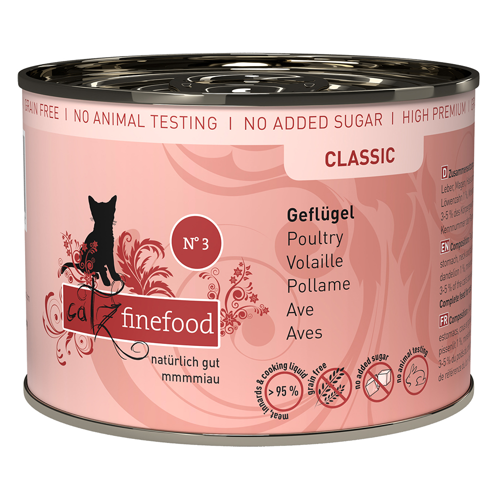 De vitaliteit en gezondheid van een kat hangen in grote mate van haar voeding af. catz finefood staat voor een soortgerichte, evenwichtige en natuurlijke kattenvoeding. De afzonderlijke recepturen komen overeen met de natuurlijke voeding en bevatten zo alle belangrijke voedingsstoffen en proteïnen, die de natuur voor katten had voorzien. Daarom wordt geheel afgezien van de toevoeging van graan, wat katten slechts moeilijk kunnen verteren. Alleen het beste vlees en orgaanvlees van betrouwbare, Duitse landbouwbedrijven, evenals vis uit vrije en duurzame visvangst worden voor de productie gebruikt. De hoogwaardige, verse ingrediënten landen na nauwkeurige en veterinair-medische controle in de koud-afvulling. Dit garandeert een hoogste mate van kwaliteit en veiligheid. Bij het behoedzaam gaarstomen blijven vrijwel alle belangrijke voedingsstoffen en essentiële vetzuren bewaard. Dit voer wordt uitsluitend in Duitsland bereid. catz finefood is zeer goed verteerbaar en goed verdraagbaar, en ook uitstekend geschikt voor gevoelige of allergische katten. catz finefood in één oogopslag: productie uitsluitend in Duitsland gegarandeerd gentechniekvrij zonder toevoeging van graan hoge acceptatie en goed verdraagbaar zeer hoog vlees- c.q. visaandeel laag gehalte fruit en groente vlees en orgaanvlees alleen in de beste, levensmiddelkwaliteit van Duitse landbouwbedrijven vis uit vrije en duurzame visvangst levensnoodzakelijk taurine voor de bevordering van de hartspierfunctie en voor het behoud van het gezichtsvermogen rijk aan vitaminen voor vitaliteit de natuurlijke voeding overeenkomende recepturen nauwkeurige en veterinair-medische controle van de ingrediënten voor de verwerking door koud afvullen en behoedzaam gaarstomen blijven vrijwel alle voedingsstoffen en essentiële vetzuren bewaard ontwikkeld in nauwe samenwerking met voedingswetenschappers en dierenartsen catz finefood is gegarandeerd VRIJ VAN: vormvlees botmeel protein-vervangingsstoffen, zoals soja graan kunstmatige kleurstoffen lokstoffen kunstmatige aroma’s conserveringsstoffen Gemengd pakket 1: 6 x 200 g Zalm Gevogelte 6 x 200 g Gevogelte Garnalen Gemengd pakket 2: 6 x 200 g Gevogelte 6 x 200 g Kip Tonijn Profiteer van korting! Een voordeelpakket catz finefood 12 x 200 g nu extra voordelig!