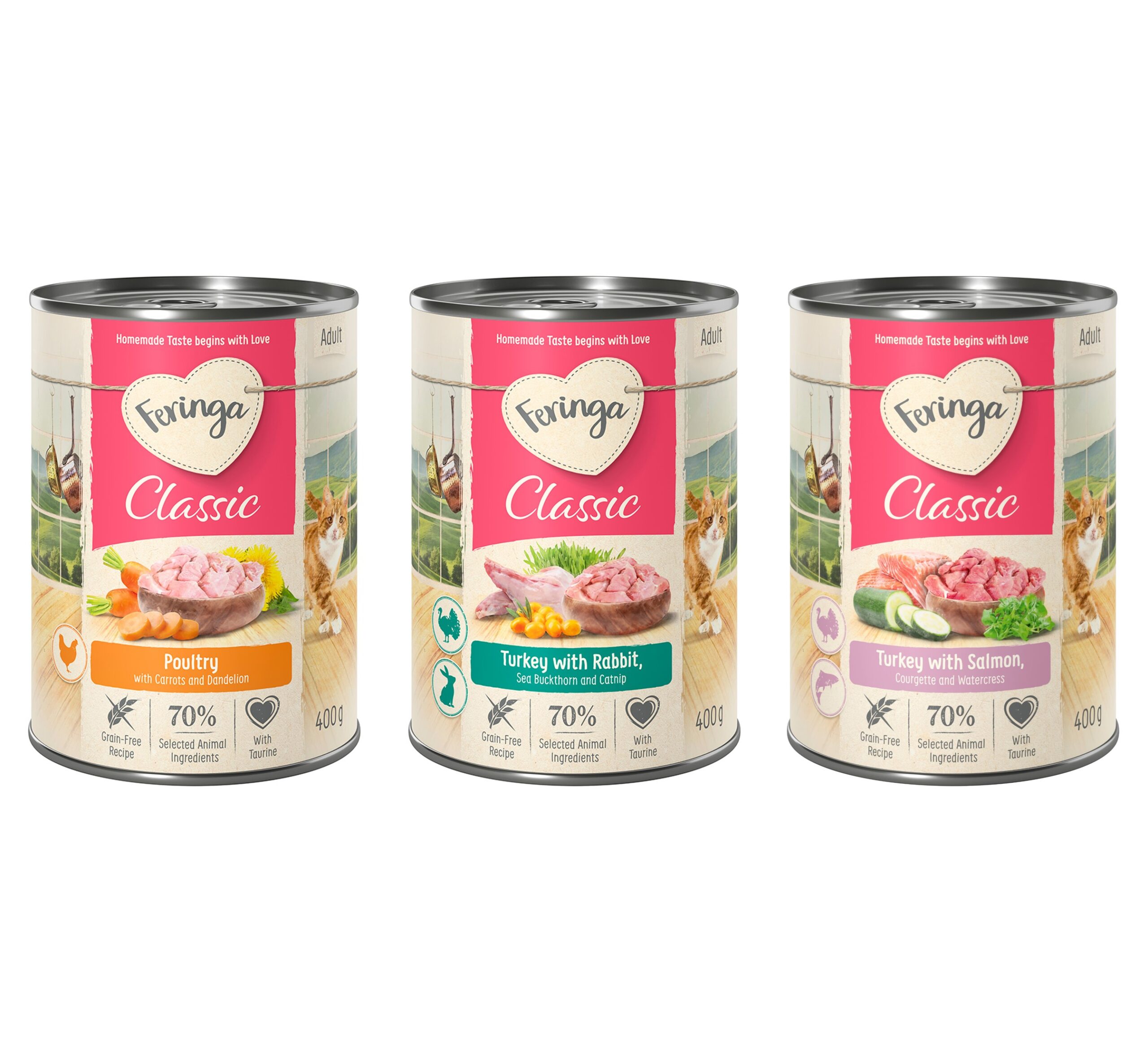 12x400g Feringa Classic Meat Menu Mixpakket 1 (Konijn & Kalkoen, Gevogelte, Zalm & Kalkoen) Kattenvoer