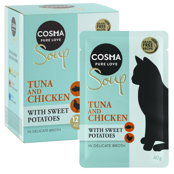 De nieuwe soep van Cosma is voor jouw kat een waar genotsmoment en voorziet het diertje van vocht. Elke variant is afgestemd op de behoeften van je dier en is bereid met het beste vlees of vis: heerlijke kippenborst en kipfilet, zorgvuldig geselecteerde zalm en ook malse tonijn. Dit alles is verrijkt met pompoen, courgette, wortels en zoete aardappelen. Deze heerlijke ingrediënten worden geserveerd in een smakelijke bouillon. De receptuur van Cosma Soup bestaat enkel uit natuurlijke ingrediënten, is graanvrij en bevat geen kunstmatige toevoegingen. Een genot voor het oog en de smaakpapillen van jouw viervoeter! De voeding is op praktische wijze verpakt per portie en daarom kun je de voeding altijd heerlijk vers serveren. De kenmerken van dit product in één oogopslag: Aanvullend voer voor volwassen katten De enige echte Cosma kwaliteit Voor een extra bijzonder genotsmoment Gemaakt met de beste natuurlijke ingrediënten Zonder kunstmatige toevoegingen Graanvrij Praktisch per portie verpakt Het handige probeerpakket bevat alle 4 de nieuwe varianten: Hartige kippenborst met smaakvolle pompoen Zorgvuldig geselecteerde zalm met courgette Malse tonijn met heerlijke worteltjes Smakelijke kipfilet met fijne tonijn en zoete aardappel Mix (4 soorten) bevat: 3 x Tonijn 3 x Zalm 3 x Kip 3 x Tonijn en Kip Mix 2 (4 soorten) bevat: 3 x Kip met Asperges 3 x Kip met Lever en Broccoli 3 x Kip en Zalm met Courgettes en Wortelen 3 x Tonijn met Ewrten Ontdek nu de heerlijke soepen van Cosma en verwen jouw kat met veel liefde!