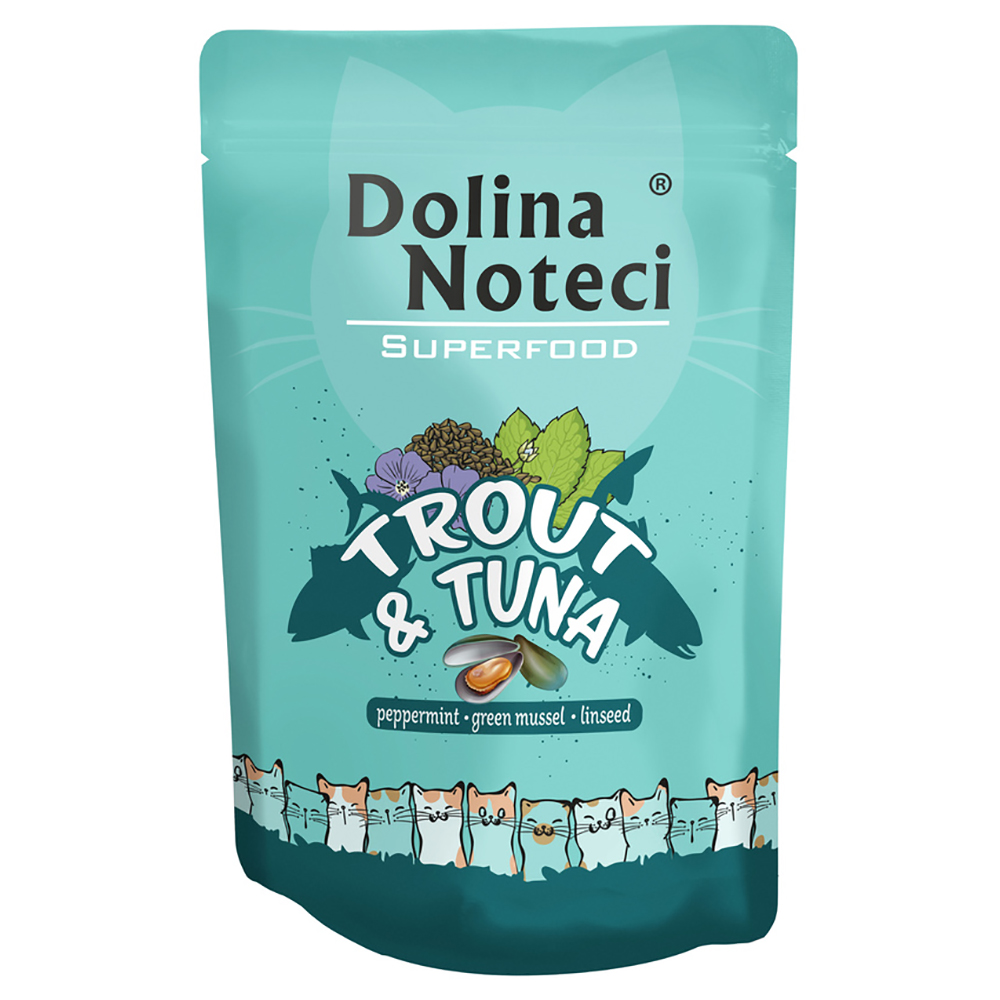 Veel vlees en een heerlijke mix van superfoods die rijk zijn aan vitale stoffen: Dolina Noteci Superfood voor katten overtuigt met een hoogwaardige samenstelling die jouw kat voorziet van alle belangrijke voedingsstoffen en belooft maximaal genot bij elke maaltijd. De natvoer is graanvrij en daarom ook geschikt voor katten met intoleranties. Het heeft een hoog vleesgehalte en bevat geselecteerde ingrediënten, waaronder lijnzaad, groenlipmossel en pepermunt. De ingrediënten kunnen onder andere de spijsvertering en de natuurlijke gewrichtsfunctie ondersteunen. Dolina Noteci Superfood 10 x 85 g in één oogopslag: Evenwichtig natvoer voor volwassen katten Veel vlees: 80% dierlijke ingrediënten, rijk aan waardevolle eiwitten en vetzuren Verrijkt met groenlipmossel: een bron van glycosaminoglycanen, die een bestanddeel zijn van o.a. kraakbeenweefsel en gewrichtsvloeistof Ondersteunt de spijsvertering: bevat lijnzaad, pepermunt en fenegriekzaad Met spirulina: als plantaardige eiwitbron Graanvrij: geschikt voor katten met voedselintoleranties en allergieën Met vitaminen mineralen: in licht verteerbare samenstelling, rijk aan vitale voedingsstoffen Variatie in de voerbak: verschillende smaken beschikbaar Portiezakjes: voor vers genot bij elke maaltijd