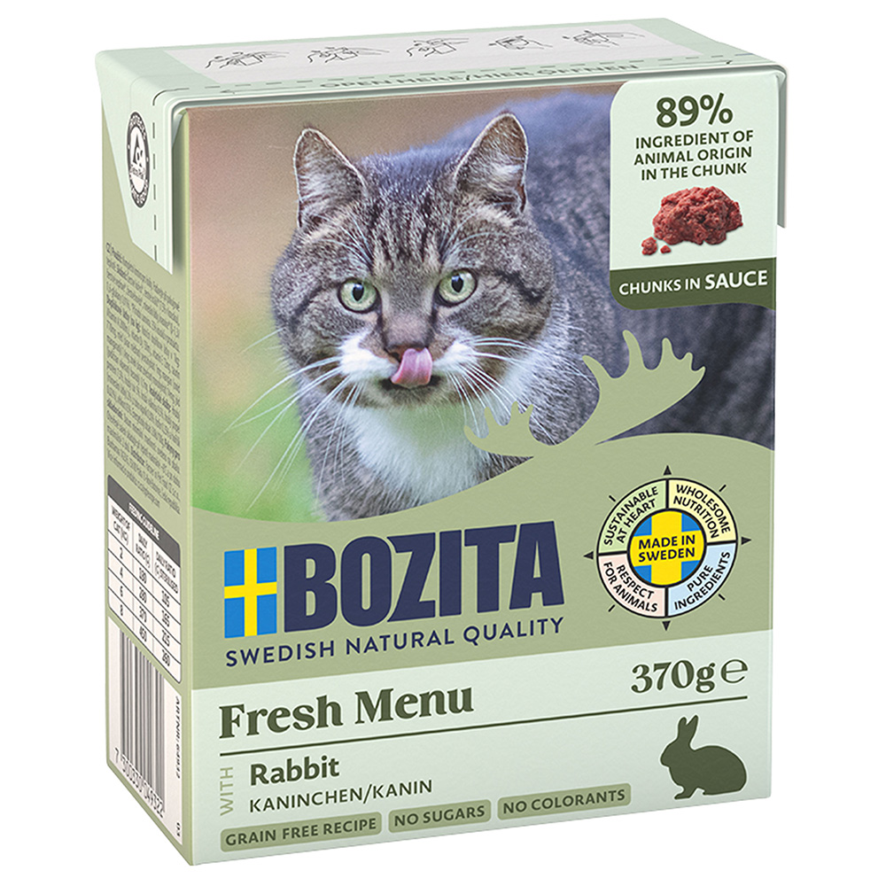 Dankzij de hoogwaardige eiwitten bevat Bozita een uitgebalanceerde verhouding aminozuren. Bozita Tetra Morsels in Saus is van nature rijk aan vitamine A, D en E en het aminozuur taurine. Vitamine A en taurine zijn bijzonder belangrijk voor het gezichtsvermogen. Daarnaast bevat Bozita een optimale hoeveelheid omega-3 vetzuren, die zorgen voor een glanzende en zachte vacht. Vitamine E is toegevoegd omdat het een positief effect heeft op het immuunsysteem en natuurlijke antioxidanten bevat. Bozita is verpakt in Tetra Recart, een kartonnen verpakking waarvan de eigenschappen lijken op die van een blikje. In tegenstelling tot een blikje is een Tetra Recart verpakking echter veel milieu- en klimaatvriendelijker. Het is licht, ruimtebesparend en recyclebaar. Minder CO2 en energie tijdens productie en transport beschermen de natuur. Tetra Recart is zowel gemakkelijk te openen als te hersluiten! Bozita mixpakket in één oogopslag: Mixpaket Saus: 12 x met kip kalkoen en 12 x zalm in saus. Bozita Tetra Hapjes in Saus 12 x 370 g: Het gebruik van vers vlees verhoogt de verteerbaarheid zorgt voor een hoge smaakacceptatie Zonder kunstmatige smaakversterkers en conserveringsmiddelen Voorziet de kat van alle voedingsstoffen, vitaminen en mineralen Met veel vers rundvlees, varkensvlees, gevogelte of vis Verwerkt regionale grondstoffen uit Zweden Bevat Marcogard ter ondersteuning van het immuunsysteem In milieuvriendelijke Tetra Recart verpakking Het spreekt voor zich dat er geen dierproeven worden uitgevoerd.