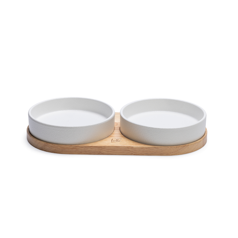 De Designed by Lotte Lojs keramische dinerset voor katten voegt een vleugje elegantie en stijl toe aan je interieur. De set bestaat uit twee elegante kommen van keramiek, die op een robuust dienblad van echt hout staan. De brede bakjes zijn speciaal ontworpen om zacht te zijn voor de snorharen van je kat en bieden genoeg ruimte voor natvoer of water. Dankzij de waterbestendige coating zijn de kommen van de Designed by Lotte keramische dinerset Lojs voor katten vaatwasmachinebestendig en daardoor bijzonder gemakkelijk schoon te maken en duurzaam. Of het nu voor voedsel of water is, deze set is de perfecte keuze voor veeleisende katten en hun baasjes die waarde hechten aan kwaliteit en design. Designed by Lotte keramische dinerset Lojs voor katten in één oogopslag: Elegante voerbak voor katten Hoogwaardige materialen: twee keramische kommen op een dienblad van echt hout Extra brede kommen: zacht voor de snorharen van je kat Waterdichte coating: Schalen geschikt voor de vaatwasser Veelzijdig gebruik: ook geschikt voor natvoer of water Antislip: met inkepingen voor de kommen in de houten lade Kleur: natuurlijk / wit Materiaal: Hout, keramiek Capaciteit: 2 x 350 ml Afmetingen: Totale afmetingen: L 34 x B 17 x H 5,5 cm Voerbakken: 2 x Ø 16,35 x H 3,5 cm