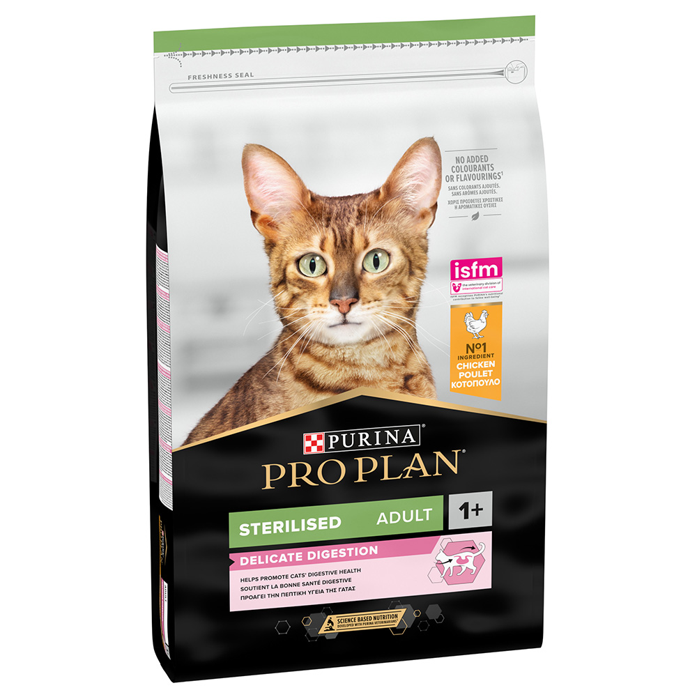 Gesteriliseerde en gecastreerde volwassen katten hebben speciale voedingsbehoeften waar rekening mee gehouden moet worden. Purina Pro Plan Sterilised Adult Delicate Digestion is hierop afgestemd en helpt onder andere bij gewichtsbeheersing. Het energie- en voedingsstoffengehalte is aangepast, waardoor je fluwelen pootje makkelijker zijn ideale gewicht kan behouden. Het droogvoer is bereid met veel kip, dat dient als leverancier van hoogwaardige, licht verteerbare eiwitten. Deze zijn belangrijk voor het behoud van magere spieren. De speciale Optidigest-formule met natuurlijke prebiotica kan een normale spijsvertering bevorderen. De knapperige textuur van de brokjes kan helpen bij de gebitsverzorging, omdat het de mechanische afslijting van tandplak tijdens het kauwen ondersteunt. Purina Pro Plan Sterilised Adult Delicate Digestion in één oogopslag: Droogvoer voor volwassen gesteriliseerde en gecastreerde katten vanaf 1 jaar. Gewichtscontrole: uitgebalanceerd gehalte aan vet, eiwit en koolhydraten ter ondersteuning van gewichtscontrole na sterilisatie/castratie. Kip als 1e ingrediënt: licht verteerbaar, levert hoogwaardige eiwitten Optidigest formule: met natuurlijke prebiotica ter ondersteuning van een normale spijsvertering Ondersteuning urinewegen: evenwichtige samenstelling om een normale gezondheid van de urinewegen te bevorderen Knapperige brokjes: de textuur van het voer kan de tandverzorging ondersteunen en tandplak en tandsteenvorming helpen voorkomen Uitgebalanceerd en gezond: geschikt voor dagelijkse voeding Zonder kunstmatige kleur- of smaakstoffen Zeer smakelijk: wordt zelfs door veel kieskeurige katten goed geaccepteerd