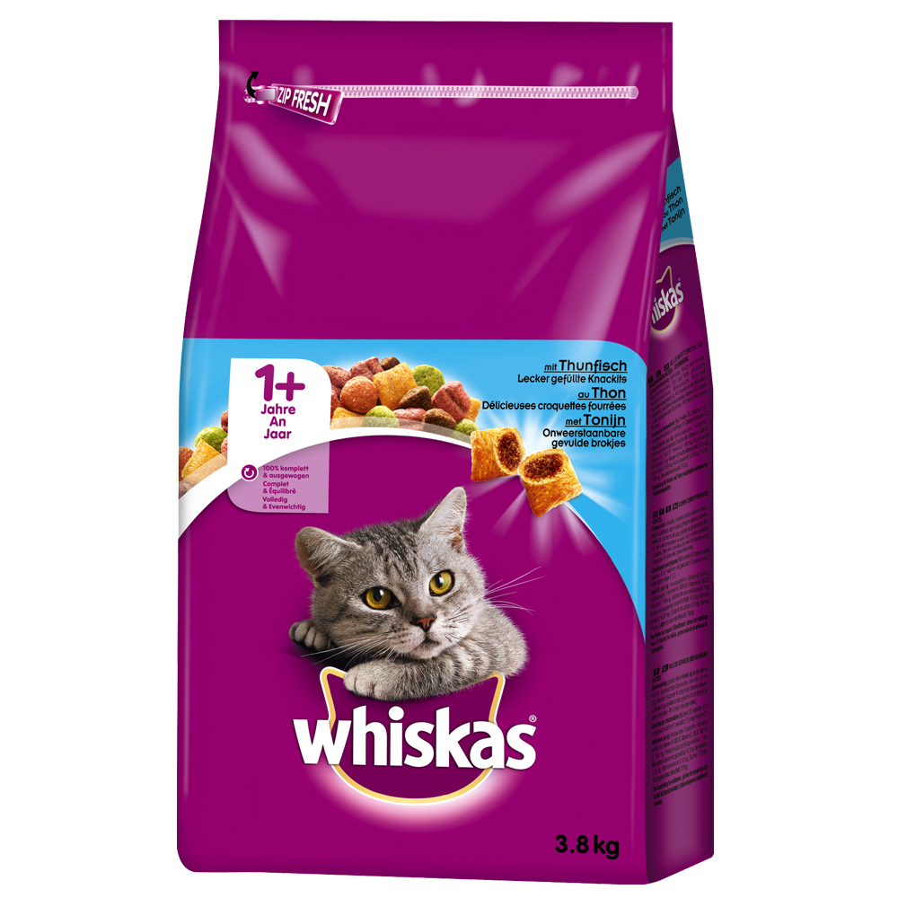 Het droogvoer van Whiskas wordt met vers vlees bereid, zoals katten het lekker vinden. Daardoor bevat het veel belangrijke vitaminen en mineralen. Het bijzondere van dit voer zijn de lekkere knackits, buiten krokant en binnen kostelijk gevuld. Zo verwent u uw kat de hele dag met de passende snack! Het ruime assortiment voer van Whiskas kattenvoer biedt alles, waar uw kat van houdt. Bij Whiskas kattenvoer is voor een rijke afwisseling op het menu van uw kat gezorgd. Whiskas adult kip: met vleesrijke vulling, kostelijke kipsmaak speciaal voor volwassen katten, dental protection plus en kostelijke knackits in één Whiskas adult tonijn: met vleesrijke vulling van tonijn – droogvoeding voor volwassen katten, met kostelijke knackits, met dental protection plus Whiskas adult lam: voor volwassen katten, lekker droogvoer met kostelijke knackits, speciaal dental protection plus ter verzorging van de tanden, met delicaat lam Profiteer van onze voordeelpakketten. Bestel nu! 2 x 3,8 kg Whiskas droogvoer naar keuze in gemengd pakkket – nu langdurig voordelig! Meer informatie over de afzonderlijke producten vindt u via de volgende links. Let wel, dat deze aanbieding alleen onder artikelnummer 600514 verkrijgbaar is. Whiskas Adult Kip Whiskas Adult Tonijn Whiskas Adult Lam
