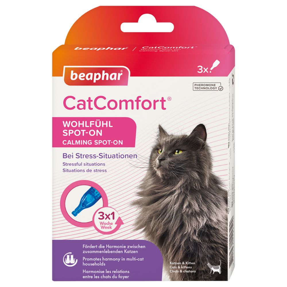 De beaphar CatComfort Spot-On zorgt voor meer ontspanning en een gevoel van geborgenheid. Het bevat een synthetische variant van het feromoon dat de moederpoes bij het zogen produceert om hun kittens te kalmeren. De vertrouwde feromonen kunnen jouw kat helpen zich ontspannen en veilig te voelen. Het preparaat is ook geschikt om katten in stressvolle situaties te ondersteunen. Denk dan bijvoorbeeld aan verhuizingen, dierenartsbezoeken of veranderingen binnenshuis. Bovendien kan het van pas komen in huishoudens met meerdere katten voor een harmonieuze sfeer. De beaphar CatComfort Spot-On wordt door middel van een pipet tussen de oren op de hoofdhuid van je kat gedruppeld. beaphar CatComfort Spot-On in één oogopslag: Kalmerende spot-on voor katten Met rustgevend feromoon: synthetische variant van bekende feromonen die de moederpoes tijdens het zogen produceert Voor huishoudens met meerdere katten: bevordert een harmonieus samenleven, kan angst en spanning verminderen Ondersteuning in stressvolle situaties: helpt katten zich te ontspannen en geborgen te voelen Voor veel situaties: bij stress door verhuizingen, dierenartsbezoekjes, vuurwerk, nieuwe familieleden etc. Kan eraan bijdragen de relatie tussen mens en dier te verbeteren Geschikt voor katten van ieder ras: zodra ze het nest hebben verlaten Met het doel om: de harmonie en ontspanning bij katten te bevorderen Toepassing: wordt op de hoofdhuid gedruppeld Werkzame stof: analogon van een rustgevend kattenferomoon Gebruiksinterval: bij behoefte / inhoud van 1 pipet werkt ca. 1 week Hoeveelheid per pipet: 0,55 ml Inhoud: 3 pipetten Gebruiksaanwijzing Druppel de inhoud van een pipet op de hoofdhuid tussen de oren. Het middel werkt ca. 1 week. Als je tegelijkertijd een middel ter bescherming tegen tekens of vlooien gebruikt, breng de beaphar CatComfort Spot-On dan niet op dezelfde plek aan. De spot-on moet minstens 15 minuten voor stressvolle situaties worden aangebracht. De werking kan na wassen of sterke regenval worden verminderd. Breng de spot-on niet aan op beschadigde huid. Bewaar het product op een droge plek en buiten bereik van kinderen. Het is geschikt voor katten van alle rassen zodra ze het nest hebben verlaten. Voor een optimaal resultaat moet je de toediening van het middel iedere week herhalen.
