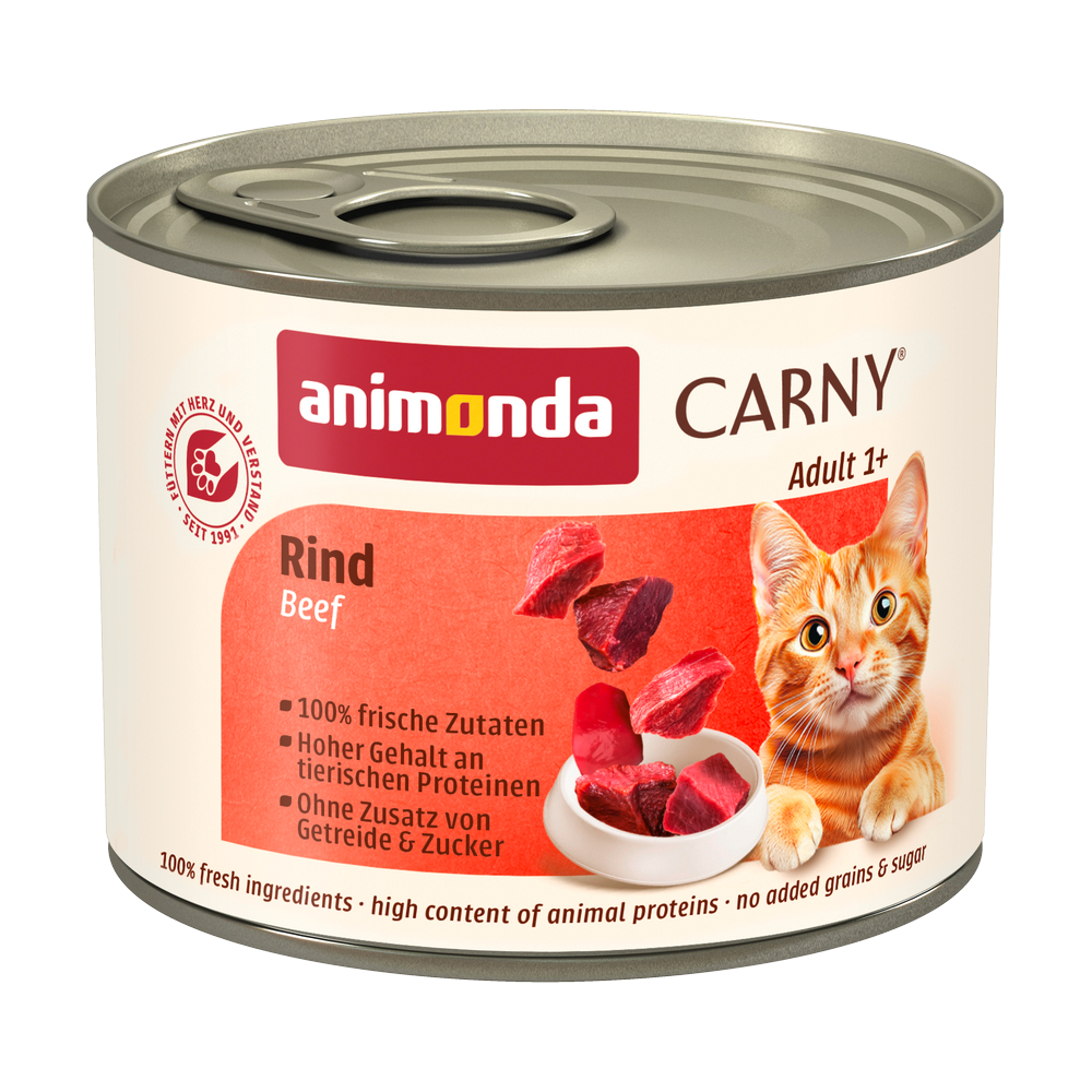 De natuurlijke voeding van katten draait geheel om vlees, plantaardige bestanddelen zijn voor een soortgerichte en natuurlijke voeding ongeschikt, omdat katten daardoor niet alle belangrijke voedingsstoffen binnen krijgen. Bovendien zijn granen een bron van voedingsonverdraagzaamheden en kunnen vaak moeilijk worden verteerd. Op basis hiervan wordt bij de receptuur van animonda Carny Adult geheel van het gebruik van granen afgezien. Ook soja, wat eveneens een hoog allergisch potentieel heeft, wordt niet gebruikt. Als belangrijke bron van proteïne zijn alleen verse ingrediënten waaronder hart, long, spiervlees en lever gebruikt. Deze hoogwaardige dierlijke eiwitbronnen leveren bovendien natuurlijke taurine, een aminozuur dat essentieel voor katten is. Dat is namelijk een aminozuur dat een kat niet zelf kan aanmaken en moet het daarom uit voeding halen. Taurine bevordert onder andere een sterk immuunsysteem, een gezond hart en het zicht. Ook een glanzende vacht en gezonde huid worden erdoor bevorderd. Van het gebruik van kunstmatige kleurstoffen of conserveringsmiddelen wordt ook compleet afgezien. Door de toevoeging van belangrijke vitaminen en mineraalstoffen bevat dit voer alle voedingsstoffen die een kat nodig heeft. animonda Carny Adult in een overzicht: Gebalanceerd compleetvoer voor alle volwassen katten Ideaal voor gevoelige en allergische katten Granenvrij: Voor de beste verdraagzaamheid en verteerbaarheid Uitsluitend vers vlees en ingewanden: Levert de beste proteïne en natuurlijke taurine Openheid: Wat op het etiket staat zit er ook werkelijk in ZONDER: Conserveringsmiddelen, kleurstoffen, smaakversterkers, soja en suiker