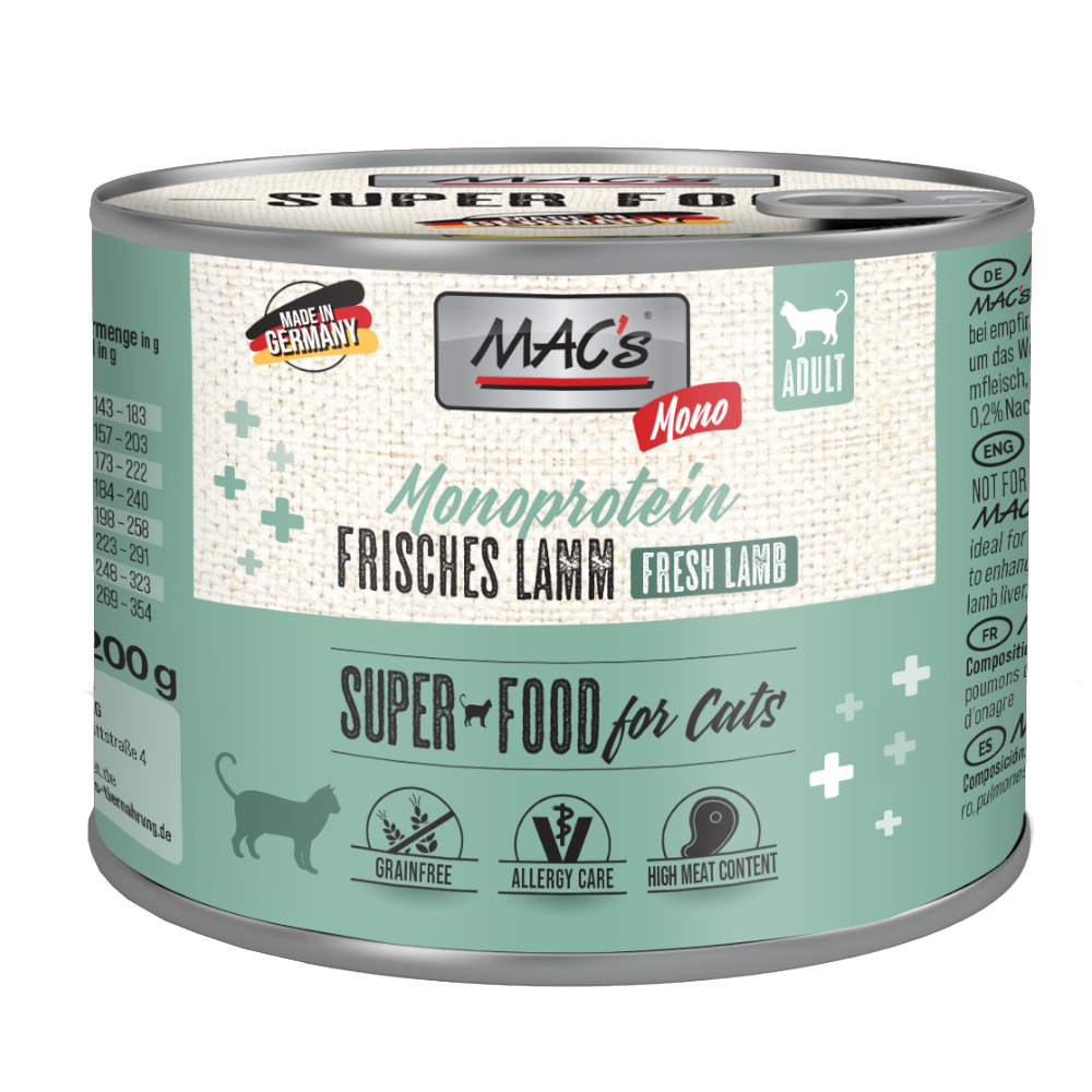 MAC’s Cat Mono is een laag allergeen natvoer op basis van slechts één soort vlees. Het is speciaal ontwikkeld voor de voeding van volwassen katten die gevoelig zijn voor voedselallergieën en is zeer licht verteerbaar. Dankzij de monoproteïnereceptuur is het voer goed geschikt voor uitsluitingsdiëten. Het hoge vleesgehalte in MAC’s Cat Mono past goed in een soorteigen dieet en zorgt er ook voor dat het voer zeer gemakkelijk wordt geaccepteerd. De afwezigheid van granen en soja bij de productie van MAC’s Mono Sensitive kattenvoer draagt extra bij tot een goede tolerantie. Het kattenvoer bevat geen voorgevormd vlees of dier- en beendermeel. De productie vindt plaats in Duitsland. MAC’s Cat Mono Sensitive Kattenvoer in één oogopslag: Hoogwaardig natvoer voor volwassen katten Laag in allergenen en licht verteerbaar: bijzonder goed verdraagbaar, ideaal voor katten met voedingsgevoeligheden Goed voor uitsluitingsdiëten: slechts één soort vlees als dierlijke eiwitbron Zeer hoog vleesgehalte: voor een aan de soort aangepast en natuurlijk dieet Heerlijke smaak: evenwichtige receptuur, goed geaccepteerd Zonder granen, gluten en soja Zonder vormvlees, diermeel en beendermeel Zonder kunstmatige kleur- en smaakstoffen Kwaliteit uit Duitse productie