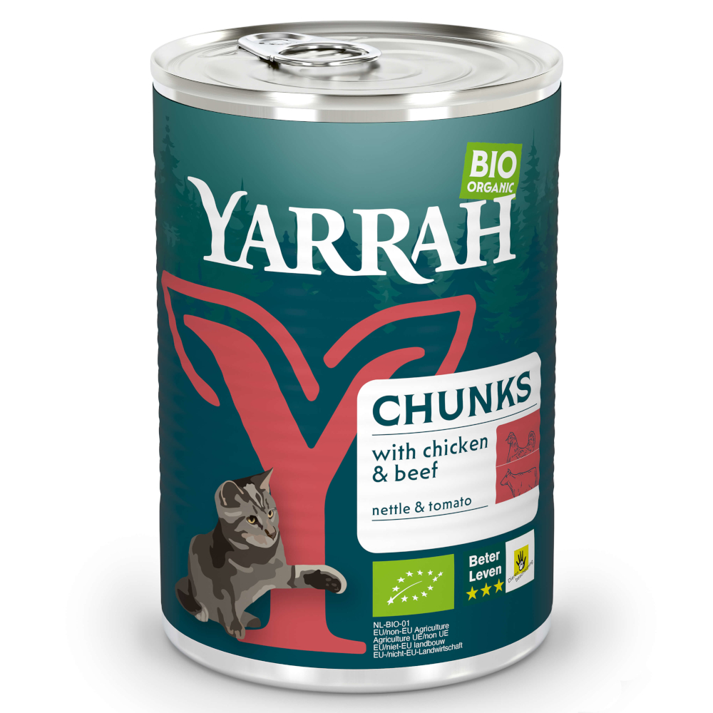 Overheerlijke chunks met biologische kip, aangevuld met biologisch gecertificeerde brandnetel en tomaat. Geschikt voor alle kattensoorten en leeftijden, van kittens tot senior katten. Het biologische natvoer vormt een complete, voedzame en zeer smakelijke maaltijd voor je kat. Zuiver voer, vrij van kunstmatige toevoegingen, pesticiden en GMO, waarbij de best opneembare eiwitten zijn geselecteerd. Zo krijgt je kat precies binnen wat hij nodig heeft. Katten zijn gek op de brokjes in saus. De kleine stukjes zijn makkelijk te eten. De smaken van het vlees zijn in de saus getrokken, waardoor het natvoer nog beter smaakt. De chunks in blik zijn ideaal voor katten met een grote eetlust of als je meerdere katten hebt. Yarrah adviseert natvoer voor iedere kat. Natvoer bevat veel vocht en helpt je kat gehydrateerd te blijven. Vooral oudere katten en katten die weinig drinken, hebben baat bij een dagelijkse portie natvoer. Verschillende smaken: Kip Kip en Rund Kip en Kalkoen Yarrah biologisch kattenvoer Chunks met Kip Dit 405 grams blik bevat 31% biologische kip. De biologische kippen verwerkt in het voer hebben een beter leven gehad, waarbij ze buiten hebben mogen scharrelen, puur biologisch hebben gegeten en langer hebben mogen leven dan reguliere kippen. Het voer bevat kip vanwege de goede verteerbaarheid en omdat katten er dol op zijn. Kip is daarnaast een duurzame keuze, omdat kip een kleinere ecologische voetafdruk heeft dan bijvoorbeeld rundvlees. De toegevoegde, biologische brandnetel heeft een positieve invloed op de nierwerking van je kat en draagt bij aan gezonde urinewegen. Biologische tomaten zijn rijk aan vitamines en ondersteunen het immuunsysteem. Yarrah biologisch kattenvoer Chunks met Kip en Rund Dit 405 grams blik bevat zowel biologische kip als rund. De biologische kippen en runderen verwerkt in het voer hebben een beter leven gehad, waarbij ze vrij buiten hebben mogen lopen, puur biologisch hebben gegeten en langer hebben mogen leven dan reguliere kippen en runderen. Biologisch rund is gecombineerd met biologische kip om de impact op het milieu te beperken, omdat kip een kleinere ecologische voetafdruk heeft dan rundvlees. De toegevoegde, biologische brandnetel heeft een positieve invloed op de nierwerking van je kat en draagt bij aan gezonde urinewegen. Biologische tomaten zijn rijk aan vitamines en ondersteunen het immuunsysteem. Yarrah biologisch kattenvoer Chunks met Kip en Kalkoen Dit 405 grams blik bevat zowel biologische kip als kalkoen. De biologische kippen en kalkoenen verwerkt in het voer hebben een beter leven gehad, waarbij ze buiten hebben mogen scharrelen, puur biologisch hebben gegeten en langer hebben mogen leven dan reguliere kippen en kalkoenen. Het voer bevat kip en kalkoen vanwege goede verteerbaarheid en omdat katten er dol op zijn. De toegevoegde, biologische brandnetel heeft een positieve invloed op de nierwerking van je kat en draagt bij aan gezonde urinewegen. Biologische tomaten zijn rijk aan vitamines en ondersteunen het immuunsysteem. Yarrah Sinds 1992 produceert Yarrah biologisch honden- en kattenvoer. Bio is voor Yarrah geen hype, maar een bewuste keuze om een positieve verandering teweeg te brengen. Leveranciers worden persoonlijk bezocht om de hechte relatie te onderhouden en de kwaliteit van de biologische producten verder te verbeteren. Geen verborgen ingrediënten, geen chemische toevoegingen, gewoon zuiver biologisch voer voor honden en katten sinds 1992.