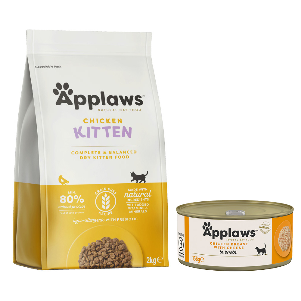 Applaws Gemengd Probeerpakket: Droog- & Natvoer in Voordeelset – 2 kg Kitten droogvoer + 6 x 156 g Kippenborst & Kaas