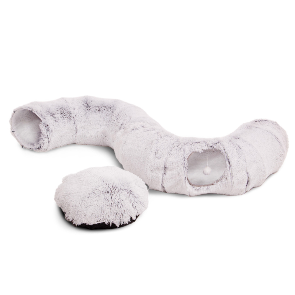De Canadian Cat Company donut tunnel incl. ligkussen biedt je kat een vermakelijk verstoppertje met het unieke donutontwerp. De twee identieke tunneldelen zijn voorzien van verbindingslussen waardoor je fluwelen pootje er moeiteloos in en uit kan glijden. De pluizige langbont imitatie buitenkant zorgt voor een extra knusse ervaring waar je kat dol op zal zijn. In het midden van de tunnel ligt een extra donzig kussen met een antislip onderkantdat een comfortabele rustplaats biedt. Of je de stukken nu apart plaatst of samenvoegt tot een donut tunnel, plezier is gegarandeerd. Er is ook een bungelende pluche bal bij de ingang om het speelinstinct van je kat te stimuleren. Canadian Cat Company donut tunnel incl. ligkussen in één oogopslag: Kattentunnel voor nieuwsgierige katten om in te spelen en te ontspannen Flexibel op te zetten: wordt geleverd in 3 delen, kan worden ontworpen als donut tunnel, lang of gebogen Pluizige buitenkant: Imitatie lang bont voor gezellige momenten Uitbreidbaar: kan worden aangesloten op andere tunnels Met vier ingangen: heel leuk, vooral voor meerdere katten Speelprikkel: bungelende pluche bal voor extra plezier Centrale rustplaats: donzig kussen met antislip onderkant Praktische lussen: om vast te maken of op te bergen Kleur: grijs Materiaal: Polyester Afmetingen: Totaal: ongeveer Ø 80 x H 26 cm Lengte van de afzonderlijke tunnels: ca. 80 cm Diameter van de tunnel: ongeveer 26 cm Diameter van het kussen: ca. 45 cm Let op: Alleen voor gebruik door huisdieren. Niet geschikt voor kinderen! Laat huisdieren nooit zonder toezicht alleen met het speelgoed. Geen enkel speelgoed is onverslijtbaar. Laat je huisdier geen speelgoed meer gebruiken dat beschadigd of kapot is of waarvan onderdelen ontbreken. Raadpleeg onmiddellijk een dierenarts als er per ongeluk kleine onderdelen worden ingeslikt. Uit de buurt van hittebronnen en open vlammen houden. Gooi het product en de verpakkingsmaterialen weg volgens de lokale normen en voorschriften.
