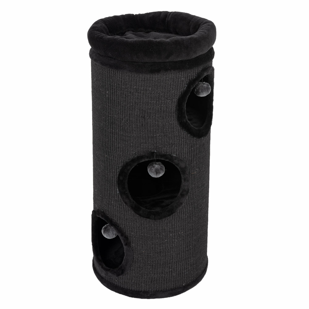 De krabton Diogenes L is voor iedere speelse kat een eldorado. De drie schuin boven elkaar aangebrachte openingen bieden ook voor meerdere katten een plek om naar hartelust te stoeien. De twee onderste hollen zijn binnenin met elkaar verbonden, zodat uw kat makkelijker naar boven kan klimmen, het bovenste hol dient als terugtrekplek en slaapplaats voor speelvrije uren. Helemaal bovenin troont daarentegen het zeer geliefde uitzichtsplatform met zacht pluche bedje, van waaruit de omgeving kan worden geobserveerd. Ook door de robuuste en hoogwaardige krabmat uit sisal is de speelton Diogenes L beslist snel het nieuwe lievelingsplekje van uw kat. Krabton Diogenes Diagonal Basic in één oogopslag: Krab- en speelton met comfortabele ligplaatsen Om te spelen, te krabben en te slapen Bedekt met slijtvaste sisal krasmat: ideaal voor het klimmen en slijpen van klauwen Diagonaal gerangschikte ingangen: vergemakkelijking van de toegang tot de bovenverdiepingen 3 holtes: met comfortabele pluche ligvlakken, binnenwanden bedekt met kunstvilt, om zich terug te trekken, te verstoppen en uit te rusten Knuffelmand met rand: comfortabel uitkijkplatform, afneembaar en machinewasbaar tot 30°C Zacht gewatteerd ligvlak: in de laagste grot, bijzonder comfortabele rustplaats Met doorgang naar de 2e verdieping: twee onderling verbonden holtes (bodem/midden), binnenwanden bedekt met kunstvilt 3 pluche speelballen: stimuleert jacht- en vangspelletjes, rammelen bij het spelen, bevordert het speelinstinct Montagevrij: eenvoudig te installeren Kleur: beige of zwart Afmetingen: Totaal: H 85 x Ø 39 cm Krabton: H 79 x Ø 39 cm Drie holtes: Binnenafmetingen: ca. Ø 37 x H 23 cm Ingangen: ca. Ø 17 cm doorgang: Ø 17 cm Knuffelbed: Totaal: Ø 41 x ca. H 6 cm Ligvlak: ca. Ø 31 cm Speelgoed: ca. Ø 4 cm Let op: alleen voor gebruik binnenshuis.