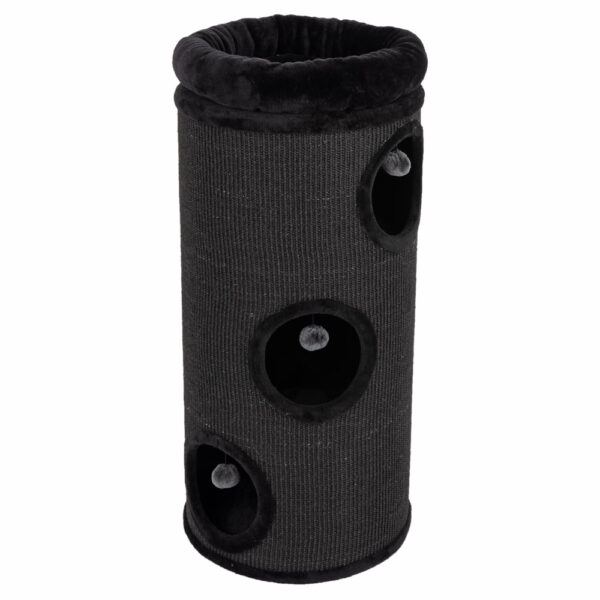 Deze krabton zorgt voor veel speel- en krabplezier evenals meerdere rustplekken. De krabton bevat 3 ronde openingen uit pluche waardoor je kat in de krabton kan klimmen. Daarbij zit er tussen de onderste twee slaapholen een gat, zodat je kat van het éne slaaphol in het andere slaaphol kan klimmen. Bovendien bungelt er een speelballetje aan de krabton, die het speel- en jachtinstinct van je kat opwekt. Bovenop de krabton bevindt zich een platform, van waaruit je kat van het uitzicht kan genieten en uit kan rusten. Door het zachte kussen bekleed met pluche, is deze plek extra zacht voor je kat. Het kussen kan, indien het vies is, eraf worden gehaald en worden gewassen. Om de nagels van je kat scherp te houden, is de krabton omwikkeld met een hoogwaardig sisal. Krabton Diogenes XL in één oogopslag: XL speel- en krabton met comfortabele terugtrekplaatsen Ideaal voor grote kattenrassen om te spelen, te krabben en te slapen. Bedekt met hoogwaardig natuurlijk sisaltapijt: slijtvast en bijzonder robuust, bestand tegen scherpe kattenklauwen, ideaal voor het klimmen, perfect voor de dagelijkse klauwverzorging 3 ruime holtes: met comfortabele pluche ligplaatsen, binnenwanden bedekt met kunstvilt, om zich terug te trekken, te verstoppen of te slapen Zachte knuffelmand: met rand om op te leunen, verwijderbaar door middel van klittenband, machinewasbaar op 30°C Groot uitkijkplatform: voor het observeren van de omgeving Diagonaal gerangschikte ingangen: vergemakkelijking van de toegang tot de bovenverdiepingen Doorgangsopening: tussen onderste en middelste grot, moedigt spelen en ravotten aan Gedempt ligvlak: in de laagste grot, bijzonder zacht en comfortabel terugtrekken 3 pluche speelballen: stimuleren je kat om te jagen Kleur: beige of zwart Afmetingen: Totaalafmetingen: H 97 x Ø 45 cm Krabton: H 89 x Ø 45 cm Drie openingen: Binnenmaat: ca. Ø 42 x H 25 cm Ingangen: ca. Ø 17 cm Doorgang: Ø 18 cm Knuffelbed: Totaal: Ø 45 x ca. H 8 cm Ligvlak: ca. Ø 32 cm Speelgoed: ca. Ø 4 cm Let op: alleen voor gebruik binnenshuis.