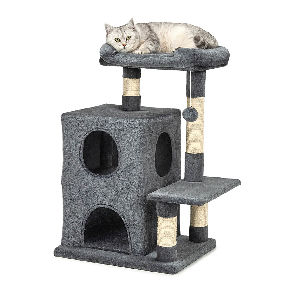 De Lionto krabpaal 80 cm biedt je kat alles wat zijn hartje begeert: twee gezellige grotten om in te schuilen en uit te rusten, een comfortabel bed om in te kijken en een hangende pluche bal met belletjes voor veel speelplezier. Het zachte pluche oppervlak zorgt voor een aangenaam gevoel tijdens het klimmen en ontspannen – perfect om nieuwe favoriete plekken te ontdekken. De slijtvaste sisal stammen nodigen je uit om je klauwen te scherpen en helpen je meubels te beschermen. Dankzij het compacte ontwerp past de krabpaal perfect in elke leefomgeving – een ruimtebesparende blikvanger die zowel jou als je kat plezier zal brengen. Montage is heel eenvoudig met de bijgeleverde instructies en de bijpassende schroevenset. Lionto krabpaal 80 cm in één oogopslag: Krabpaal met speel- en rustplekken Veelzijdige retraites: twee grotten en een ligbed bieden comfort en rust Inclusief plezier: met hangende pluche bal en bel voor actieve momenten Robuuste sisalstammen: voor dagelijkse klauwverzorging en klimmen Compact ontwerp: past in bijna elke kamer en ziet er tegelijkertijd stijlvol uit Kleur: lichtgrijs of donkergrijs Totale afmetingen: H 80 x L 50 x B 40 cm Grondplaat: L 40 x B 50 cm Platformen: L 37 x B 47 cm 2 grotten: Totaal: elk L 35 x B 35 x H 50 cm Ingang: Ø 18 cm 1 bed: Totaal: L 37 x B 47 cm Ligvlak: L 30 x B 41 cm 4 sisal krabpalen: Ø 7,1 cm 1 x L 20 cm 2 x L 23 cm 1 x L 45 cm Let op: Alleen geschikt voor binnen.