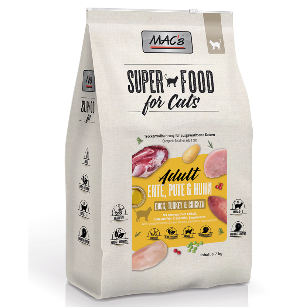 De compositie uit drie verschillende gevogeltesoorten maakt dit voer extra lekker voor uw kat. Daarbij garandeert de evenwichtige receptuur een natuurgetrouwe en vitaliteitsverhogende voedingswijze. Naast eend, kalkoen en kip bevat de makkelijk verteerbare droogvoeding waardevolle vitaminen, mineralen en vitaalstoffen evenals bergkruiden en spirulina. FOS ondersteunt als prebioticum een evenwichtige darmflora en daarmee de optimale opname van voedingsstoffen. Graan- en glutenvrij is MAC’s Cat Adult eend, kalkoen kip bijzonder goed verdraagbaar en kan ook bij allergieën worden ingezet. Noorse zalmolie is rijk aan omega-vetzuren en zorgt voor een gezonde huid en een glanzende vacht. Cranberries zijn natuurlijke zuurvormers en kunnen bacteriële blaasinfecties voorkomen. Dit effect wordt door een moderate pH-waarde van het voer nog eens extra ondersteund. Bovendien bevat het voer het voor hart en ogen belangrijke taurine evenals groenlipmossel, die de gezondheid van de gewrichten kan bevorderen. MAC´s Cat Adult eend, kalkoen kip in één oogopslag: Hoogwaardige droogvoeding voor volwassen katten Met 3 gevogelte soorten: lekkere compositie uit eend, kip en kalkoen Hoog eiwitgehalte: 46% gevogelte, zalm en garnalen dienen als hoogwaardige dierlijke eiwitbronnen Graan- glutenvrij: ook voor sensibele en allergische katten geschikt Met bergkruiden: weldadig en lekker Met cranberries en gematigde pH-waarde: ondersteunt een gezonde blaas Vitaalstofmix: evenwichtige combinatie uit vitaminen mineralen Noorse zalmolie: rijk aan omega-vetzuren, bevordert huid- en vachtgezondheid Goed verteerbaar: met veel licht gevogelte en het prebioticum FOS Anti-haarbal: receptuur kan de vorming van haarballen in de maag voorkomen Taurine: versterkt hart en ogen Met L-carnitine: stimuleert de stofwisseling Met spirulina: bevat tocoferolen, meervoudig onverzadigde vetzuren en carotinoïden Met yucca-extract: kan de ontlastingsgeur verminderen Groenlipmossel: ondersteunt gezonde gewrichten