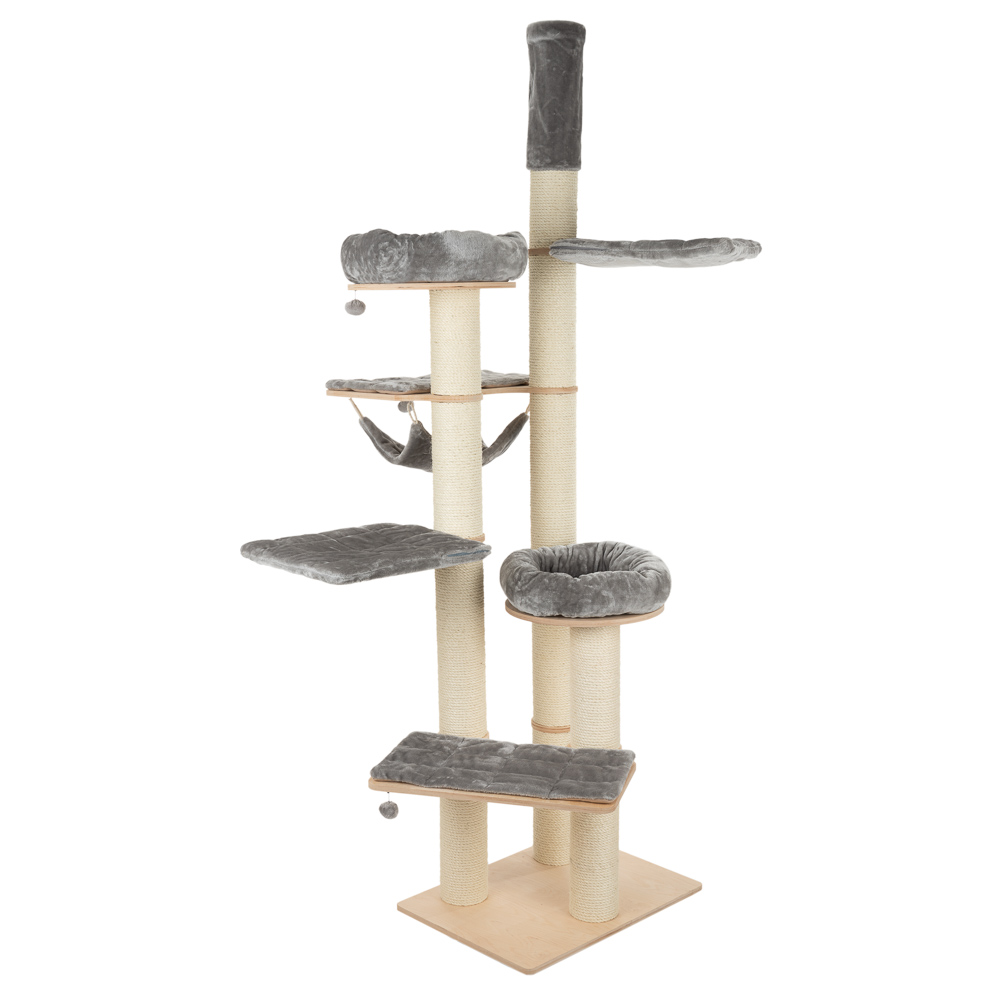 Natural Paradise is het beste bewijs van het respect van jouw baasje voor wat en wie je bent: veel meer dan een huisdier. Je bent een geliefd familielid en je verdient een aangename en gewaardeerde omgeving die aanvoelt als thuis. Daar zit onze passie. Wij zorgen er graag voor dat het huis van jouw baasje jouw natuurlijke leefruimte wordt. Zo kun je altijd jezelf zijn en je natuurlijke instincten volgen. NATURAL PARADISE. DESIGNED FOR NATURAL INSTINCTS. Wow, dat is pas een krabpaal! De krabpaal reikt tot aan de hemel! Kijk, er zijn heel veel gezellige ligmogelijkheden om uit te rusten en om de omgeving te observeren. Geen probleem als je het moet delen met andere katten. Hier is genoeg ruimte voor iedereen. En de krabpaal ziet er ook stevig uit: perfect voor knappe katten zoals jij! De krabstammen zijn veel dikker en langer dan andere krabmeubels. Daar kun je echt genieten van klauwverzorging. Probeer het maar eens! Oh, je wilt liever een tijdje chillen. Geen probleem. Je hoeft alleen maar een van de comfortabele kattenbedden te kiezen! Natural Paradise Krabpaal Amaryllis in één oogopslag: Kamerhoge krabpaal met grote ligvlakken op verschillende hoogtes Ideaal voor een huishouden met meerdere katten, maar ook geschikt voor grotere en zwaardere kattenrassen Transformeerbaar De krabpaal kan op meerdere manieren worden gemonteerd. De krabpaal past zich dus perfect aan de ruimtelijke omstandigheden aan. Hoogte individueel aanpasbaar De krabpaal kan vrij worden ingesteld op kamerhoogtes van ca. 243-265 cm.. Extra dikke en zeer lange krabpalen Met duurzame, natuurlijke sisal omwikkeld. Perfect om te klimmen en nagels te slijpen. Muren en meubilair blijven gespaard van onaangename krassporen. De bijzonder hoge krabpalen nodigen uit tot rekken en strekken tijdens het verzorgen van de klauwen. Veel ligmogelijkheden 7 ligplaatsen in verschillende variaties zorgen voor afwisseling. Ook voor gezinnen met meerdere katten bieden 2 comfortabele hangmatten, 2 zachte knuffelbedden met rand en gewatteerde platforms voldoende toevluchtsoorden om uit te rusten, te chillen en te dromen. Natuurlijke duurzame materialen De onbehandelde multiplexplaten van stabiel, Baltisch berkenmultiplex zijn afkomstig uit duurzame bosbouw.. Oeko-Tex® Standaard 100 gecertificeerd Alle bekleding is gemaakt van stoffen die getest zijn op schadelijke stoffen. Gecertificeerd textiel dat de band met de natuur benadrukt en dat je kunt vertrouwen. Verhoogde ligplaatsen: ideaal om de omgeving te observeren 7 zachte ligmogelijkheden: gevoerd en gewatteerde, klittenband houdt de ligmogelijkheden op hun plaats Kunststof voetjes ter bescherming van de vloer: helpt krassen op gevoelige vloeren te voorkomen Een afwisselend kattenparadijs Kleur: crème of lichtgrijs Materiaal: Hout: Baltisch berken multiplex Bekleding: 100% polyester (Oeko-Tex® Standard 100) Krabpalen: omwikkeld met 100% natuurlijk sisal Totale afmetingen: Als plafondkrabpaal: ca. H 243-265 x L 165 x B 112 cm (alle afmetingen zijn te vinden in de bijlage) Als krabpaal: ca. H 201 x L 165 x B 95 cm (alle afmetingen zijn te vinden in de bijlage) Let op: alleen voor gebruik binnenshuis. Let op: Zorg ervoor dat je de fleece kant van het bed vastmaakt aan het klittenband. Houd er rekening mee dat je het bed misschien moet omdraaien als het pluche aan de onderkant zit. *Informatie over levering Aangezien het artikel in twee dozen wordt verzonden, is het mogelijk dat afzonderlijke pakketten op verschillende dagen worden geleverd. Montagevoorschrift Indien een montage van de plafondspanner niet mogelijk of gewenst is, kun je de krabpaal ook zonder monteren. Let op de montage-instructies en controleer de stabiliteit voordat je jouw kat op de krabpaal laat. Voor zeer wilde katten wordt het gebruik van een wandbevestigingssysteem (niet meegeleverd) aanbevolen.