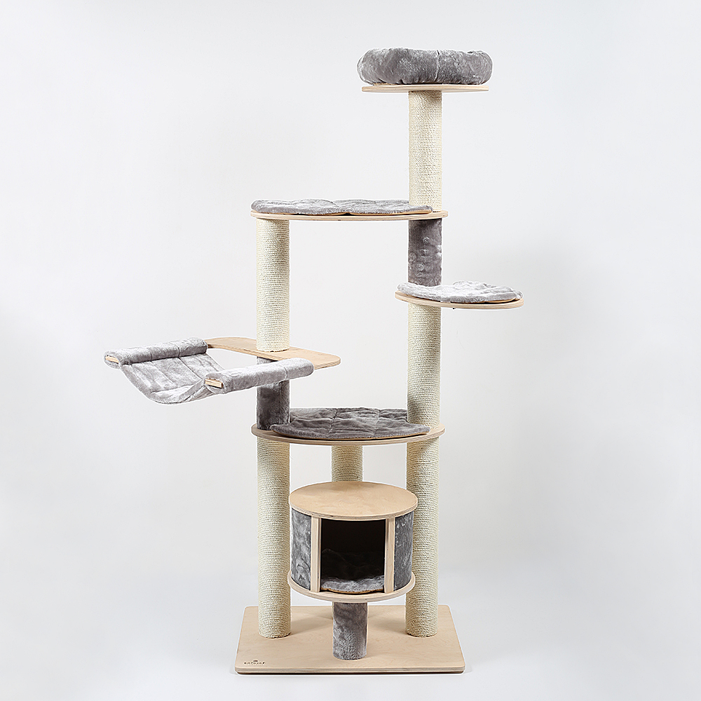 Natural Paradise is het beste bewijs van het respect van je eigenaar voor wat en wie je bent: veel meer dan een huisdier. Je bent een geliefd familielid en je verdient een prettige en liefdevolle omgeving om je thuis te voelen. Dat is waar we ons best voor doen. Wij zorgen er graag voor dat het huis van je baasje jouw natuurlijke leefruimte wordt. Zo kun je altijd jezelf zijn en je natuurlijke instincten volgen. NATURAL PARADISE. DESIGNED FOR NATURAL INSTINCTS. Heb je al eens gehoord van de Natural Paradise Krabpaal Petunia. Oh, je gaat hem geweldig vinden! Deze droom van een krabpaal is speciaal voor jou ontworpen om je uren vol speelplezier en gezelligheid te bieden. Stel je voor dat je uitrust op de vele platformen en uitkijkt over jouw koninkrijk. Je kunt ontspannen in de knusse hangmat of je terugtrekken in het ronde huisje als je wat rust nodig hebt. Het allerbeste is het feit dat alle pluche mandjes in de wasmachine kunnen worden gewassen. Zo kunnen je bedienden ze altijd schoon houden, hoe wild je avonturen ook zijn geweest. Natural Paradise Krabpaal Petunia in één oogopslag: Hoge krabpaal met veel platformen Perfect voor katten die dol zijn op krabben Staat erg stevig De zware bodemplaat van massief multiplex geeft de krabpaal een zeer goede stabiliteit. Natuurlijke sisal krabstammen Dikke sisalstammen (Ø 11 cm) bieden veel ruimte om de nagels te scherpen en voor de dagelijkse nagelverzorging. Holletje met knuffelig kussen Een natuurlijke en knusse schuilplaats om in terug te trekken en te slapen. Het houten holletje is voorzien van een zacht kussen en biedt je huistijger een comfortabele schuilplek. Comfortabel schoonmaken De bekleding en kussens kunnen er eenvoudig worden afgehaald en tot 30 °C in de wasmachine worden gewassen. Daarnaast beschermen randen van klittenband op de houten platformen tegen verschuiven van de kussens. Duurzame materialen De onbehandelde echt houten panelen van Baltisch berkenmultiplex zijn afkomstig uit duurzame bosbouw. Als ze vies zijn kun je ze gewoon schoonmaken met een vochtige doek. OEKO-TEX® Standard 100-gecertificeerd Alle bekledingen en kussens zijn gemaakt van stoffen die zijn getest op schadelijke stoffen. Gecertificeerd textiel dat de verbondenheid met de natuur benadrukt en waar je op kunt vertrouwen. Hoog uitkijkplatform: verhoogde positie voor observatie van het territorium Zachte kussens en mandjes:vast te zetten, garanderen comfortabel liggen en wegdommelen Twee pluche ballen: zetten nog meer aan om te spelen Met kunststof voetjes: om de vloer te beschermen Natuurlijk ontwerp: onbehandeld hout, past perfect in ieder interieur Hoogwaardige, katvriendelijke feel-good plek Kleur: lichtgrijs of crème Materiaal: Hout: Baltisch berkenmultiplex (uit duurzame bosbouw) Krabstammen: omwikkeld met natuurlijk sisal Bekleding: 100% polyester (Oeko-Tex®Standard 100) Totale afmetingen: max. H 193 x L 140 x B 68 cm Bodemplaat: L 75 x B 59 cm Drie platformen: ovaal: L 66 x B 45 cm ovaal: L 50 x B 35 cm ovaal: L 66 x B 45 cm Eén huisje: Ø 42 x H 28 cm Ingang: B 20 x H 25 cm Ligvlak: Ø 37 cm Eén hangmat: L 60 x B 55 cm Eén platform (voor knuffelmand): Ø 42 cm Knuffelmand met rand: Totale afmetingen: Ø 42 x H 11,5cm Ligvlak: ca. Ø 30 cm Speelgoed pluche ballen met belletje: ca. Ø 5 cm Pluche stammen, rond: Ø 11 cm 3 x L 25 cm Sisalstammen, rond: Ø 11 cm 3 x L 72 cm 2 x L 45 cm 1 x L 40 cm Let op: Alleen geschikt voor binnen.