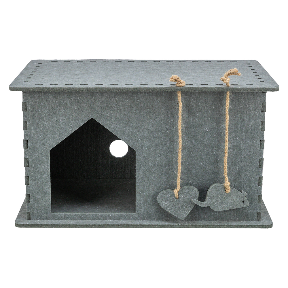 De Trixie Lene grot biedt je huiskat een knusse plek om zich te verstoppen en te ontspannen. Met zijn chique ontwerp past hij naadloos in je interieur. Dankzij het praktische plug-in systeem is deze kattengrot snel en eenvoudig op te zetten, zodat je harige vriend er meteen in kan. De twee ingangen en het kijkgaatje in de achterwand zijn bijzonder spannend, zorgen voor afwisseling en geven je kat de kans om nieuwsgierig zijn omgeving te observeren. De grot wordt geleverd met een sisal kraboppervlak, ideaal voor het verzorgen van de klauwen, en twee speeltjes – een muis en een hart aan een lint – voor extra speelplezier. Trixie Lene grot in een oogopslag: Geweldige knuffelgrot voor katten Gemaakt van vilt: onderhoudsvriendelijk, klauwbestendig en duurzaam Eenvoudige montage: snel klaar voor gebruik dankzij het plug-in systeem Twee keer zo spannend: met twee ingangen en een kijkgaatje Voor klauwverzorging: inclusief sisal kraboppervlak op de achterwand Met twee speeltjes: Muis en hart op een lint Chique ontwerp: past harmonieus in elk huis Kleur: donkergrijs Materiaal: vilt (polyester) Afmetingen: L 54 x B 30 x H 35 cm