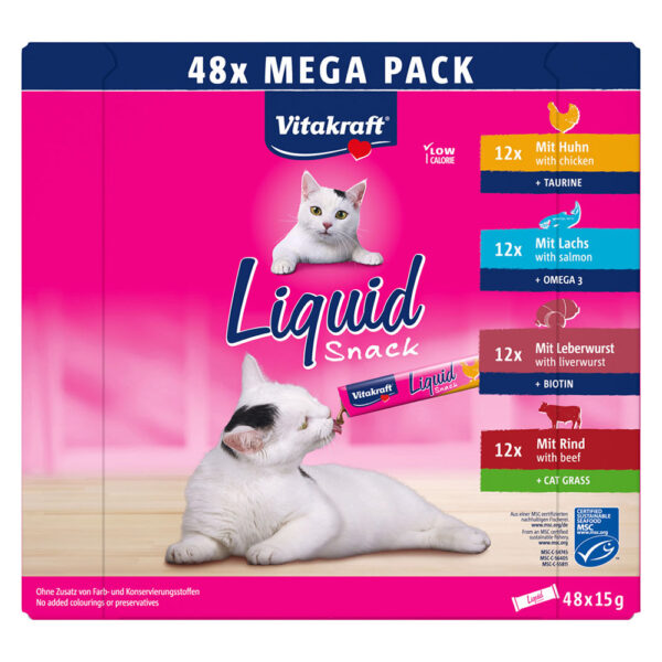 Verwen je kat met Vitakraft Cat Liquid-Snack, een fijne snackcrème die onweerstaanbaar lekker is en rechtstreeks uit de hand kan worden gegeven of als topping op het hoofdvoer kan worden geserveerd. Deze caloriearme traktatie is perfect als tussendoortje en biedt je kat een speciale traktatie. De twee verkrijgbare multipacks bevatten verschillende heerlijke varianten. De kipvariant is een bron van waardevolle taurine, terwijl de rundervariant kattengras en inuline bevat, die bijdragen aan een optimale spijsvertering. De zalmvariant levert waardevolle omega-3, terwijl de leverworstvariant biotine bevat. Je kat zal dol zijn op deze snack, en je kunt er zeker van zijn dat je hem of haar een plezier doet. Vitakraft Cat Vloeibare-Snack Multipack in één oogopslag: Fijne snackcrème voor katten Onweerstaanbaar lekker: perfect om te likken en te verwennen Laag in calorieën: genieten zonder schuldgevoel Verschillende varianten om uit te kiezen: Mix 1 bevat de volgende varianten: 8 x 15 g kip met taurine 8 x 15 g rundvlees met kattengras Mix 2 bevat de volgende varianten: 12 x 15 g kip met taurine 12 x 15 g rundvlees met kattengras 12 x 15 g zalm met omega-3 12 x 15 g leverworst met biotine Veelzijdig: geef direct uit de hand of serveer als topping op het hoofdgerecht