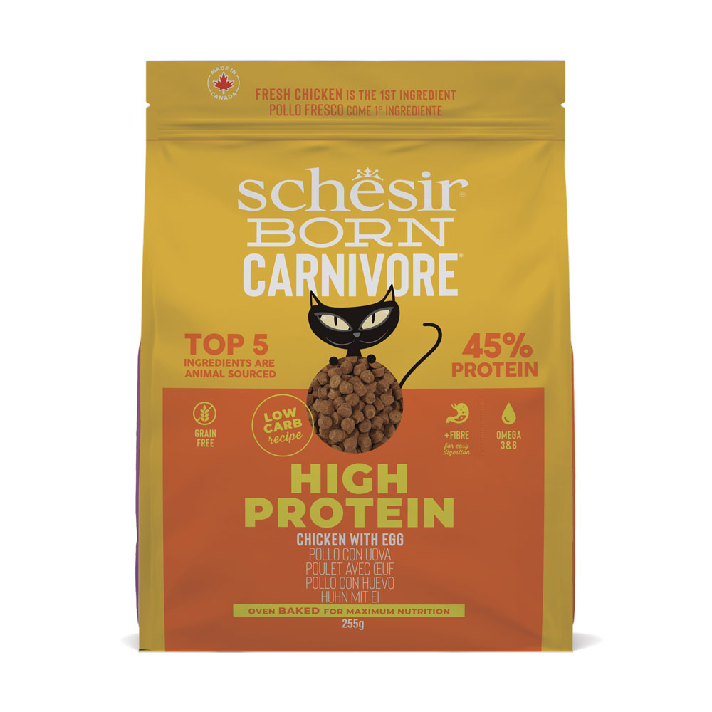 Schesir Born Carnivore High Protein Kip met Ei is het perfecte droogvoer voor je kat. Met een extra hoog eiwitgehalte van 45% ondersteunt het magere spieren en bevordert het een voeding die is afgestemd op de soort. Het recept bevat weinig koolhydraten en voldoet aan de natuurlijke behoeften van carnivoren. Het kattenvoer bevat geen graan en is daarom bijzonder licht verteerbaar en ook ideaal voor katten met een gevoelig dieet. Het eerste ingrediënt is verse kip, een uitstekende bron van licht verteerbaar eiwit. Schesir Born Carnivore High Protein Kip met Ei met vezels uit groenten en lijnzaad ondersteunt ook een optimale spijsvertering. Schesir Born Carnivore Eiwitrijke Kip met Ei in één oogopslag: Gezond droogvoer voor katten 45% eiwit: zeer hoog eiwitgehalte, voor magere spieren Recept aangepast aan diersoort: weinig koolhydraten, voldoet aan de behoeften van carnivoren Zonder granen: zeer licht verteerbaar, ideaal voor katten met een gevoelig dieet 1. Vers vlees ingrediënt: veel verse kip, bron van licht verteerbaar eiwit Spijsvertering: Vezels uit groenten Lijnzaad kan de spijsvertering bevorderen Maximaal behoud van voedingsstoffen: gebakken in de oven, heerlijke smaak Huid Vacht: essentiële omega-3 -6 vetzuren kunnen bijdragen aan een normale huid mooie vacht Gemaakt in Canada