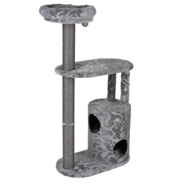 De krabpaal Vorstelijk Zilver in elegant grijs met mooie rankenstructuur is een bijzondere blikvanger in ieder interieur! Grote ligvlakken bieden veel plaats voor grote katten en een comfortabele plek om te observeren, relaxen en doezelen. Een extra dikke en hoge krabstam uit grijs, robuust natuursisal is perfect geschikt voor de dagelijkse verzorging van de klauwtjes. Aan de lange sisalstam kan hij zich goed uitrekken en strekken. Uw kat kan zich in het grote hol, met twee etages en uitneembare gestoffeerde kussens, verstoppen, spelen, terugtrekken en slapen. De stoffering van het sluimerbed met rand kan eenvoudig worden verwijderd en in de wasmachine worden gewassen. Een belletje in de speelbal daagt uit om te spelen en klimmen. Krabpaal Vorstelijk Zilver in één oogopslag: Grijze krabpaal met mooie bloemen structuur en grote ligplekken Ideaal voor grote katten In bloemdesign in elegant grijs: een blikvanger in ieder interieur Groot hol met twee ingangen en etages: ieder met comfortabel, uitneembaar kussen Ruime, ovale ligplek: voor veel plaats voor uw kat Rond comfortabel bed met rand en afneembare stoffering die te wassen is op 30°C Robuuste, extra dikke en lange sisalstam: ideaal geschikt om te rekken en strekken bij de dagelijkse verzorging van de klauwtjes Kleur: grijs met chique structuur Max. benodigde ruimte: H 138 x L 78 x B 41 cm Bodemplaat: L 70 x B 41 cm Hol met twee etages: Totale afmeting: Ø 38 x H 49 cm Binnen: à ca. Ø 36 x H ca. 22 cm Ingangen: Ø 17 cm Gestoffeerde ligplek Ovale ligplaats: Totale afmeting: L 70 x B 41 cm Ligvlak, gestoffeerd: ca. L 55 x B 41 cm Sluimerbed met gestoffeerde en gestept ligvlak en rand: Totale afmeting: Ø 40 x H 9 cm Ligvlak, gestoffeerd: ca. Ø 30 cm Afneem- en wasbaar op 30°C Pluche speelbal met belletje: ca. Ø 5 cm 3 sisalstammen, grijs: Ø 11 cm 1 x 42 cm 2 x 40 cm 2 pluche stammen: Ø 7 x L 35 cm Let op: alleen voor gebruik binnenshuis.